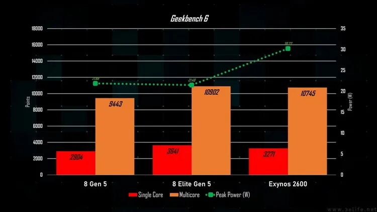比如,TechStation365用GeekBench 6的测试表明,Exynos 2600的峰值功耗会高达30.22W,比第五代骁龙8至尊版高出40%以上。