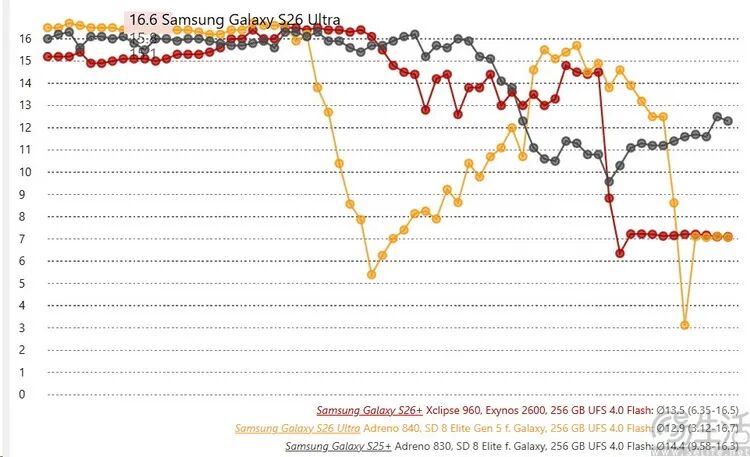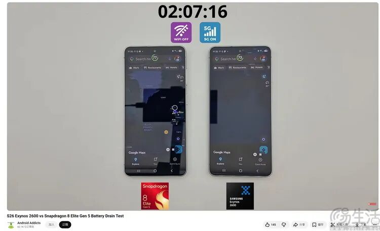 而在Android Addicts的续航测试里,搭载Exynos 2600的Galaxy S26 Ultra续航时间比同配置的第五代骁龙8至尊版机型,少了接近30%。