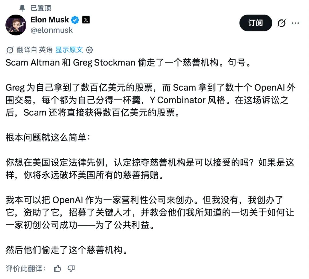 马斯克敏锐地捕捉到了这种情绪,他起诉OpenAI,本质上也是在进行一场盛大的公关战。他要把奥特曼打造成一个背弃开源精神、放弃OpenAI公益属性的恶人形象,以此来拔高自己保护大众利益的人设。