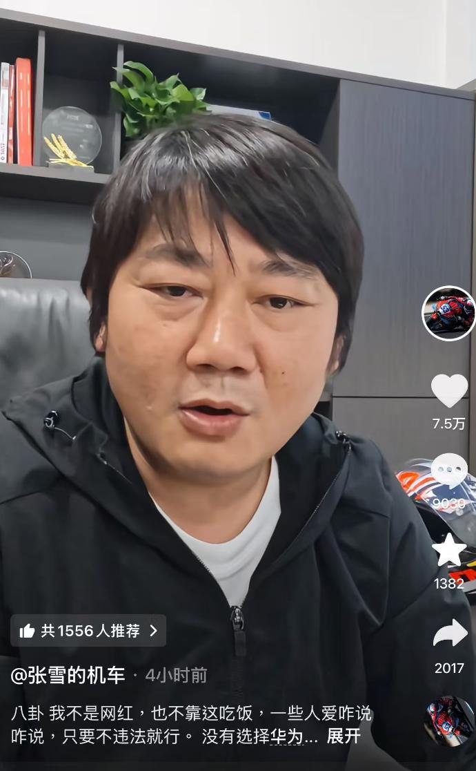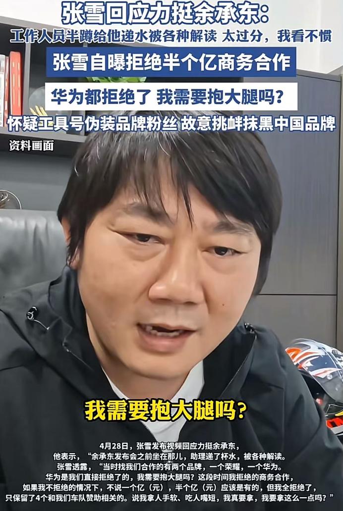 张雪随即回击:华为和荣耀都曾找过他合作,他拒绝了华为;这段时间如果不拒绝商务合作,半个亿应该有,但他只保留了4个和车队赞助相关的合作。