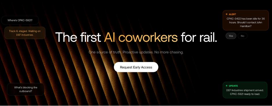 公司简介:公司致力于构建面向铁路行业的AI agent,聚焦仍高度依赖人工处理的运营流程,包括文书处理、数据录入、事故报告及计费等环节,这些流程目前仍主要通过电话、邮件及经验驱动完成。公司成立数月内已与加拿大最大铁路公司CPKC 展开合作,并与CN 进入后期洽谈阶段,同时正在为Gulf & Ohio Railways 提供产品支持。