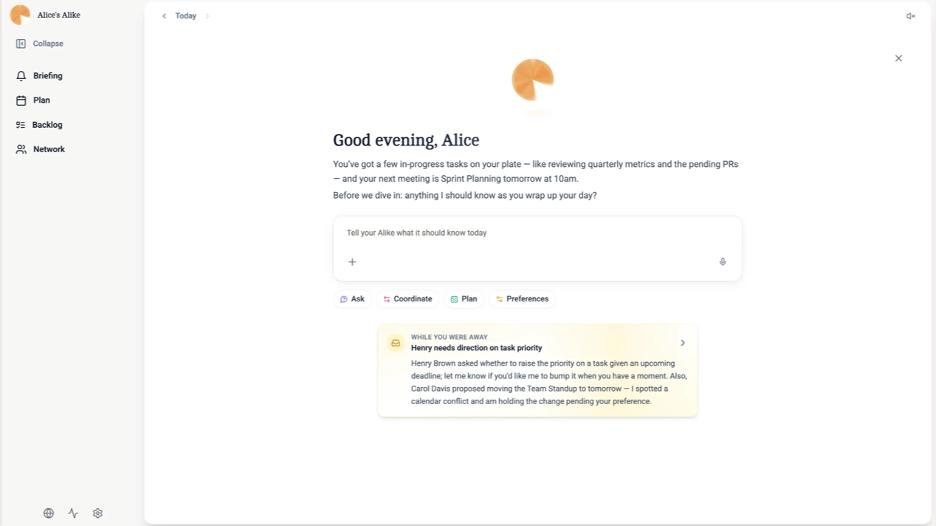 公司简介: Alike正通过自主的Agent间通信(Agent-to-Agent Communication)来颠覆Slack。目前,产品已在10家企业的团队中落地运行,通过口碑传播积累了100家公司的等待名单,并已签约20家设计合作伙伴,其中包括:Exus Renewables(获得Partners Group 10亿美元投资,为Google数据中心供电)、K-ID(由Lightspeed和a16z投资5100万美元),以及NewtonX(融资4700万美元,被Microsoft和TikTok所信赖)。
