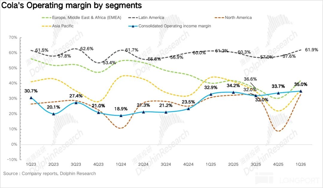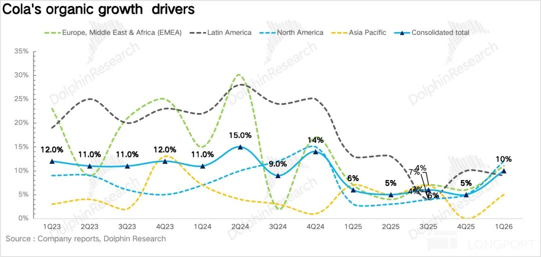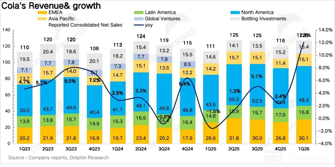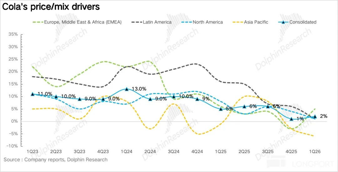 EMEA:营收 30 亿美元,同比增长 13%,其中价格/组合增长高达 5%,是全球所有战区中定价能力最强的区域,也反映出该地区消费者对可口可乐品牌溢价的接受度较高。