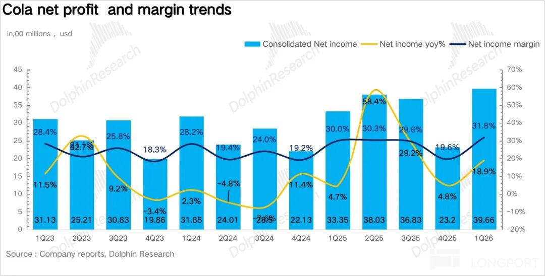 果汁、增值乳制品和植物性饮料同比下滑 1%:其中最强的是 Fairlife,目前已经占可口可乐全球销售约 5%,而且在 2026 年产能增加 30% 之后,仍有望维持 20%-30% 的有机增长速度。海豚君判断,Fairlife 在可口可乐组合里的角色,已经从 “健康饮品补充项” 升级为 “北美增长主引擎”