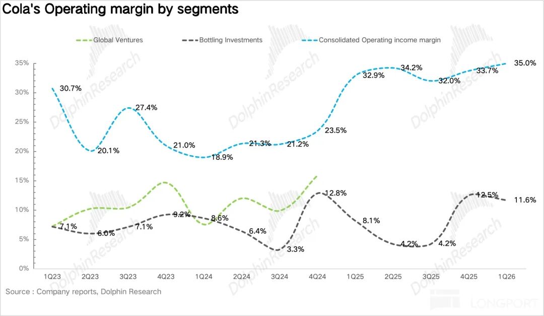 从实际数据来看也是如此——26Q1 可口可乐的核心经营利润率达到 34%,而同期百事可乐(PEP)的核心经营利润率仅为 15.7%,二者的盈利能力差距再次拉大。这背后反映的正是可口可乐极致轻资产模式 vs 百事可乐重资产全产业链整合模式,在成本波动与宏观逆风环境下的本质差异