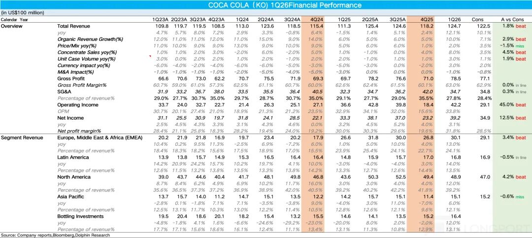 1、营收增长强劲,实现 “开门红”。1Q26 可口可乐实现表观营收 124.7 亿美元,同比增长 12%,其中内生营收同比大增 10%,量价拆分看,浓缩液销量同比增长 8%,价格/组合增长 2%。