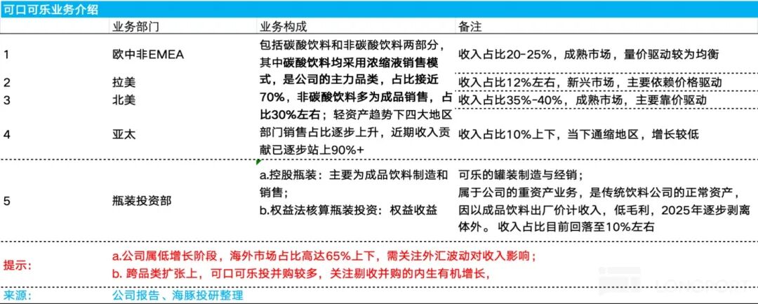 (1)其中欧洲、中东&非洲(EMEA)、拉丁美洲、北美、亚太四个部门按照地理区域划分,具体包括碳酸饮料和非碳酸饮料两部分,其中碳酸饮料均采用浓缩液销售模式,是公司的主力品类,占比接近 70%,非碳酸饮料多为成品销售,占比 30% 左右。