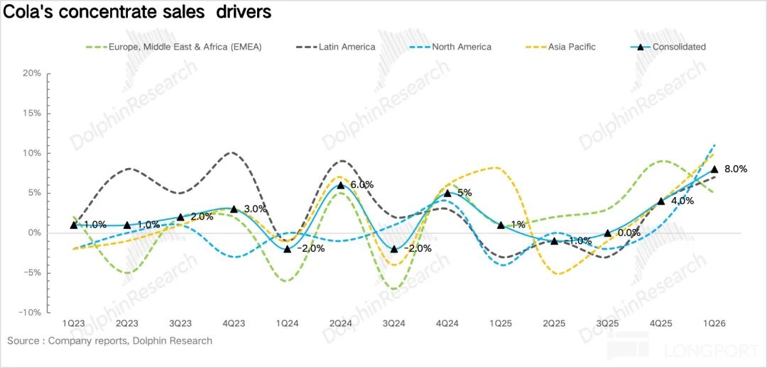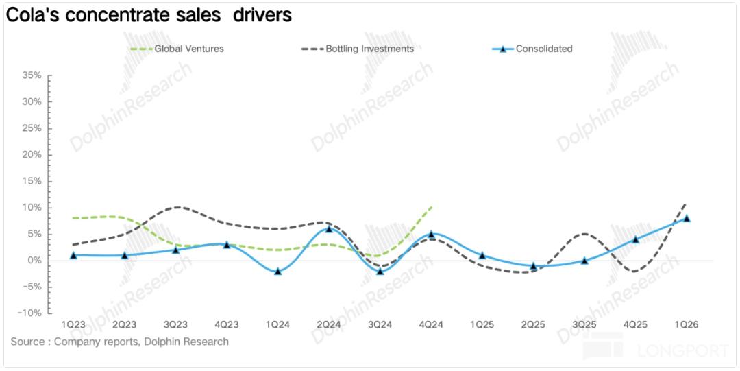 量:1Q26 浓缩液销量同比增长 8%。具体拆分来看,对于碳酸饮料品类,在全球减糖风潮下,零糖依然保持了双位数(13%)的快速增长。