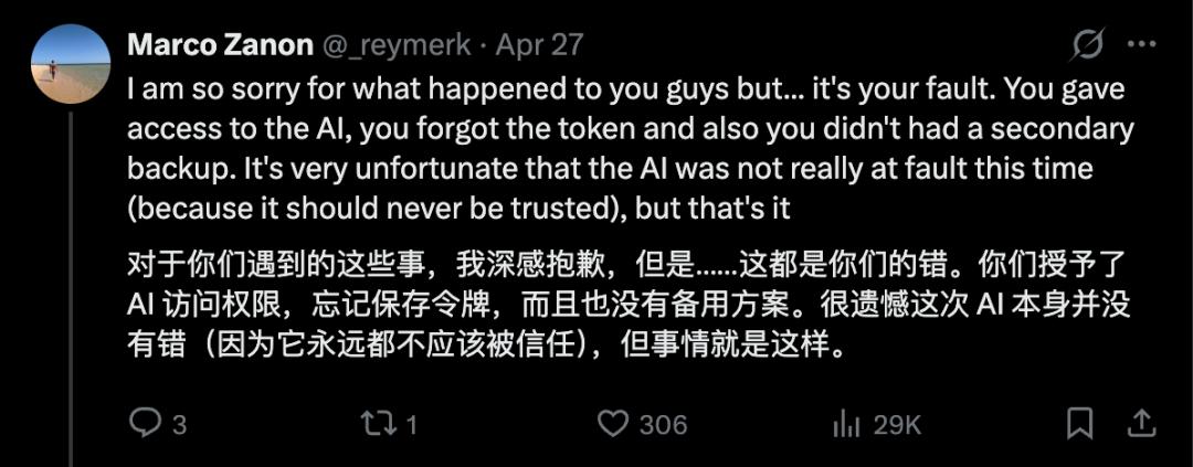 即便 AI 承认这是自己的锅,但网友们看到这件事的反应是 AI 怎么可能不经过授权就删除数据库甚至是备份,如果你不给 AI 权限,它也不会这么做。