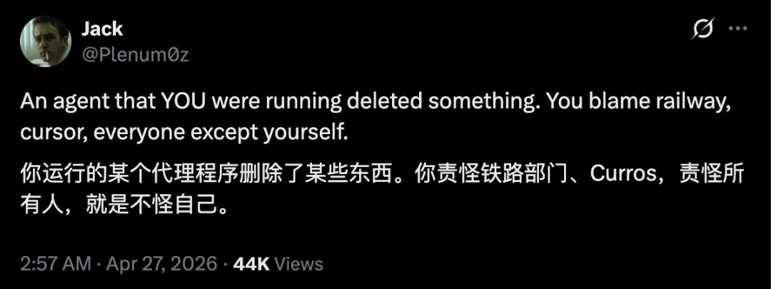 抨击完 Cursor,创始人接着表示 Railway 很拉跨,如果说 AI 出问题很常见,但是你怎么会让 AI 就把数据都给删掉了,还把备份都删除。