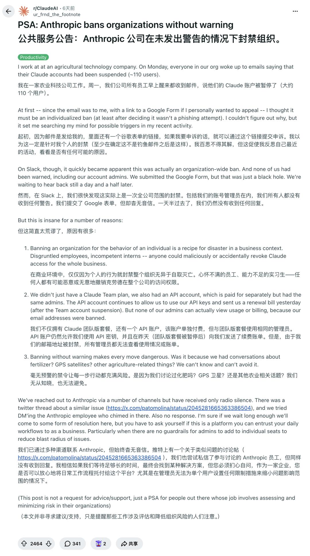 帖子链接: https://www.reddit.com/r/ClaudeAI/comments/1sspwz2/psa_anthropic_bans_organizations_without_warning/