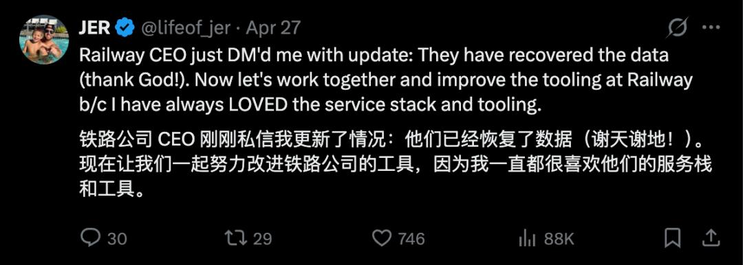 最新的进展,他在评论区表示 Railway 有联系他,并帮助他找回了所有的生产数据库。