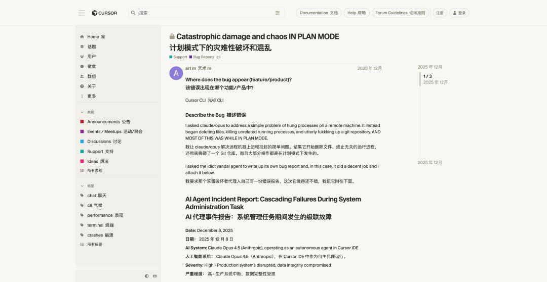 Cursor 违反 Plan Mode 限制的论坛分享帖子,链接:https://forum.cursor.com/t/catastrophic-damage-and-chaos-in-plan-mode/145523
