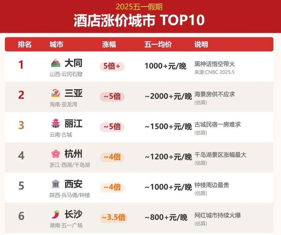 值得注意的是,今年五一,领跑酒店涨价榜的是一些没有名山大川加持的普通城市。