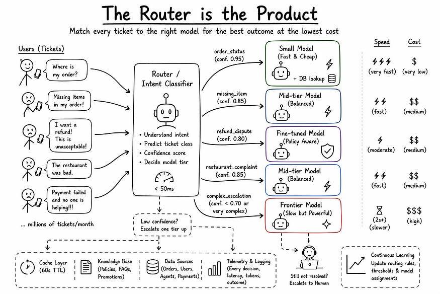 想象一下,你的CEO让你为一款每月处理200万个工单的食品配送应用程序构建一个AI客户支持代理。你觉得只要用最好的模型就行了,比如 GPT-5、Claude Opus 或 Gemini 3,接线好就发货。你算算账,就会发现投资回报率根本不划算。