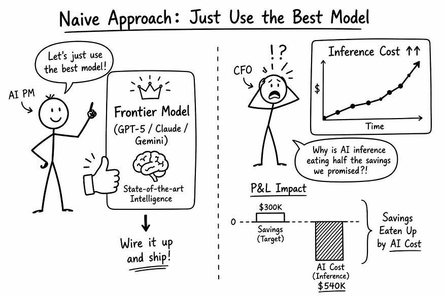 如果你作为人工智能产品经理的本能是默认选择排行榜上的前沿模型,那么你最终会推出一款赢得试点项目但最终亏损的产品。你的代理会觉得自己很聪明。你的利润率会变成负数。你的首席财务官会问,为什么人工智能推理会吞噬掉你承诺的节省 费用的一半 。