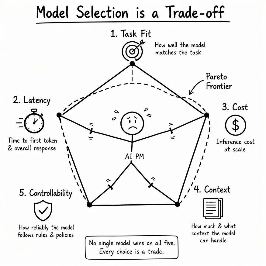 你正在帕累托前沿上选择一个点,该前沿由任务匹配度、延迟、成本、上下文和可控性定义。没有哪个模型能同时满足所有五个条件。每一个选择都是一种权衡。对于这位客服人员来说,这笔交易很复杂。如果每张 单据 都采用前沿模型,质量就会很高。