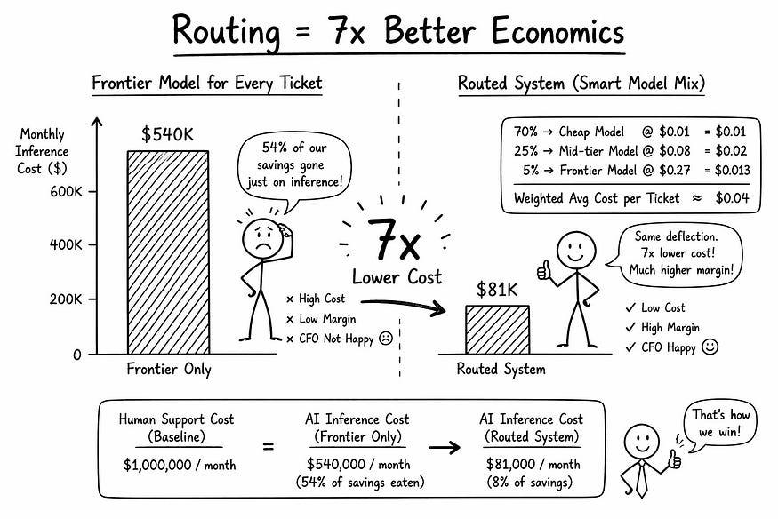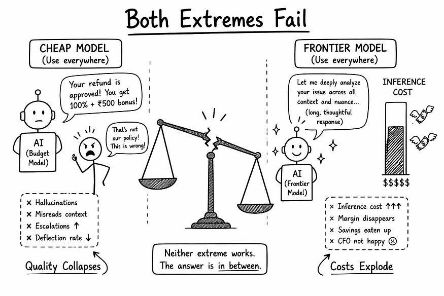如果每张 工单 都用便宜的 模型 ,成本就没问题。但该模型会臆造退款政策,误读印式英语,并且仍然会将一半的工单转交给人工处理。你的转接率从 70% 骤降至 30%。反过来,情况也一样糟糕。