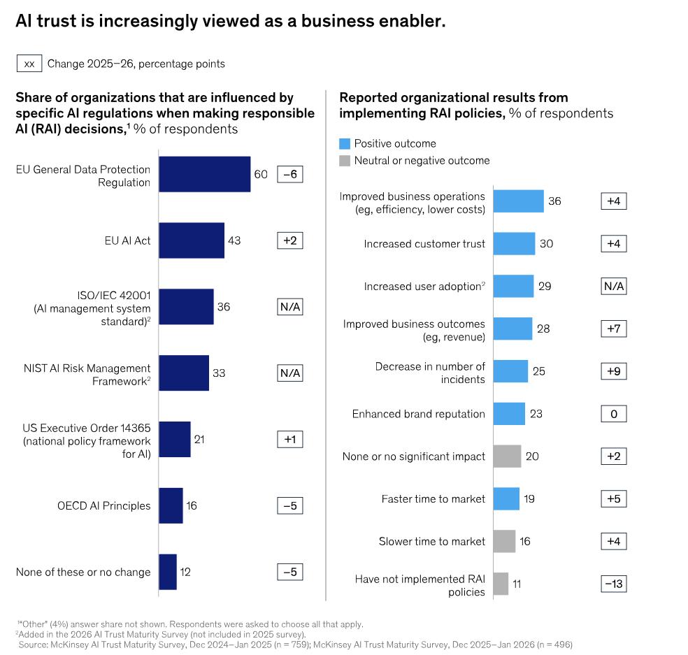 麦肯锡发现,企业越来越多地把 AI trust 视为一种 Business enabler(业务赋能器),而不再只是 Compliance exercise(合规动作)源于:麦肯锡2026AI信任度报告