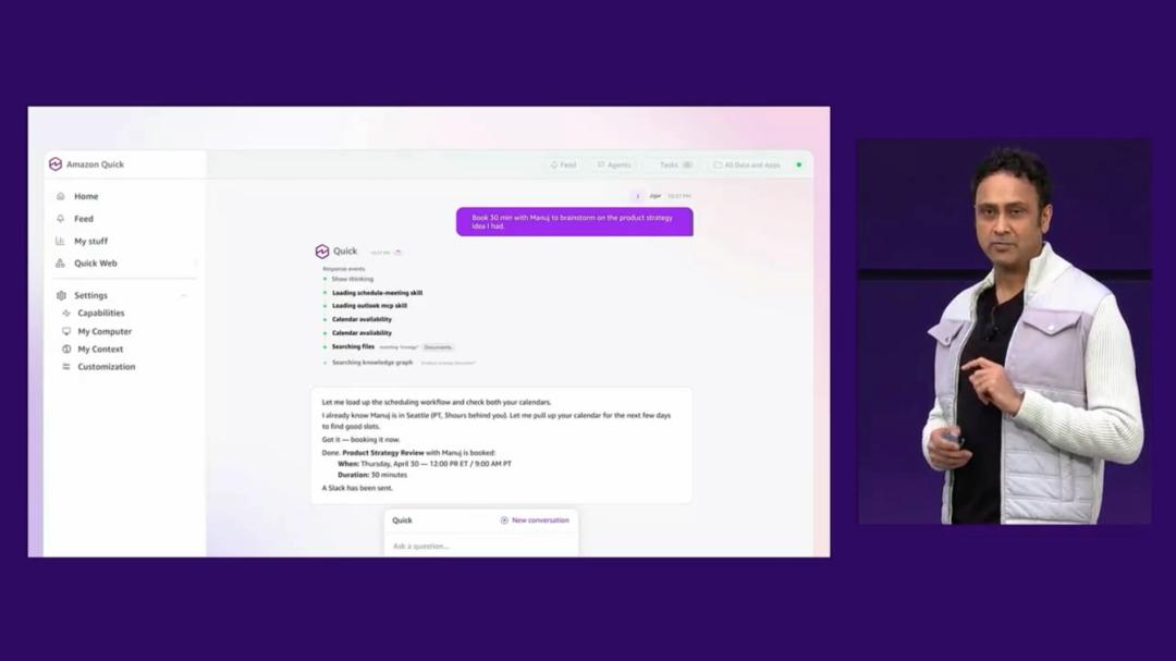 然后Amazon Quick就能秒懂项目是什么、理解同事之间的关系、自动检查日历和时区、发出会议邀请,再顺手发Slack(类似钉钉)消息通知。