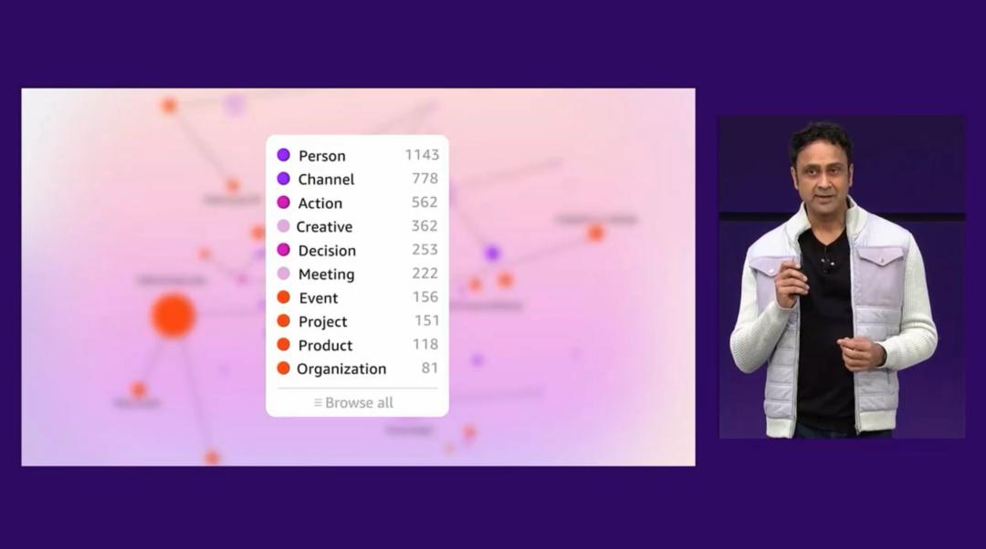 而之所以Amazon Quick能做到这一点,是因为它的背后有一张知识图谱,会连接邮件、Slack、CRM、日历、本地文档和文件等等。
