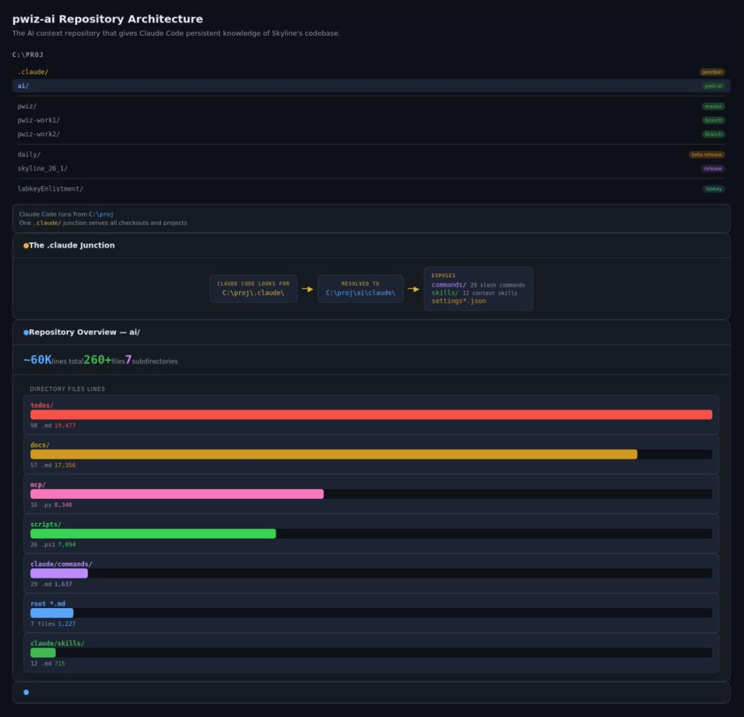 具体来说,他建了一个独立的代码仓库叫pwiz-ai,专门存放给AI看的上下文,和主代码库完全分开。根目录下的CLAUDE.md是「地形图」,告诉Claude项目的结构、编译方式、测试流程。