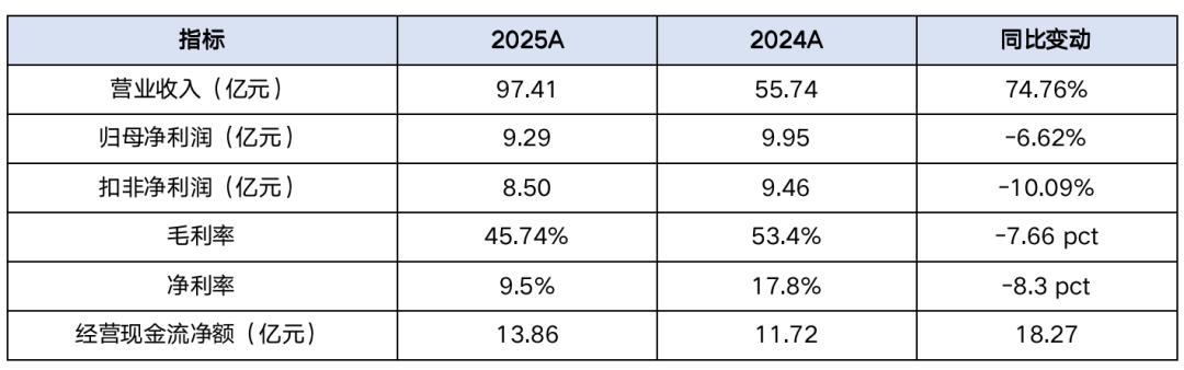 影石创新2025年财报显示,2025年公司实现营收约97.41亿元,较上年同期的约55.74亿元增长74.76%;实现归母净利润约9.29亿元,较上年同期的约9.95亿元下降6.62%;实现扣非净利润约8.50亿元,较上年同期的约9.46亿元下滑10.09%。