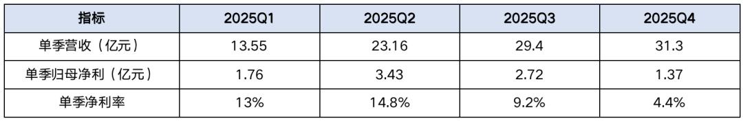 被创始人刘靖康评价为增速最快的第四季度,营收达31.3亿元,同比增长92.8%,刷新单季纪录。但利润的滑坡在这一季度更为突出——Q4归母净利润约1.37亿元,较Q3的2.72亿元进一步下滑49.6%,单季归母净利率从Q3的9.2%滑落至Q4的4.4%。
