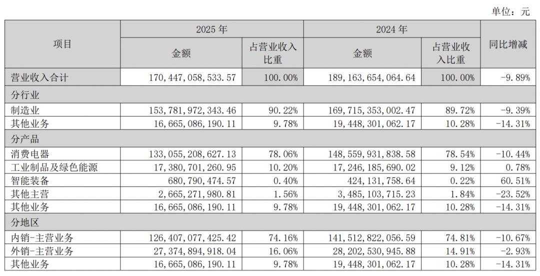 分业务来看,消费电器仍为格力业务的绝对支柱,2025年实现收入1330.55亿元,占总营收比重78.06%,但同比下降10.44%,成为拖累营收的主要因素;工业制品及绿色能源业务收入173.81亿元,占比10.20%,同比仅微增0.78%;智能装备业务表现亮眼,收入6.81亿元,同比大增60.51%,成为多元化布局中为数不多的亮点。