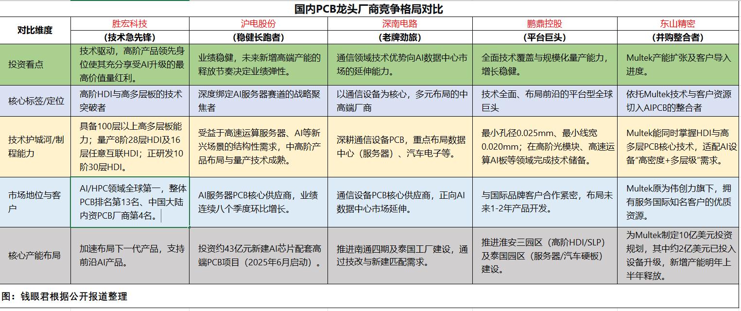 钱眼君挑选了当前市场上最具代表性的五家A股PCB龙头厂商,它们在技术路径、产能布局和市场定位上各有侧重。为更直观地展现其差异化的竞争优势,我将其核心指标汇总如下表。