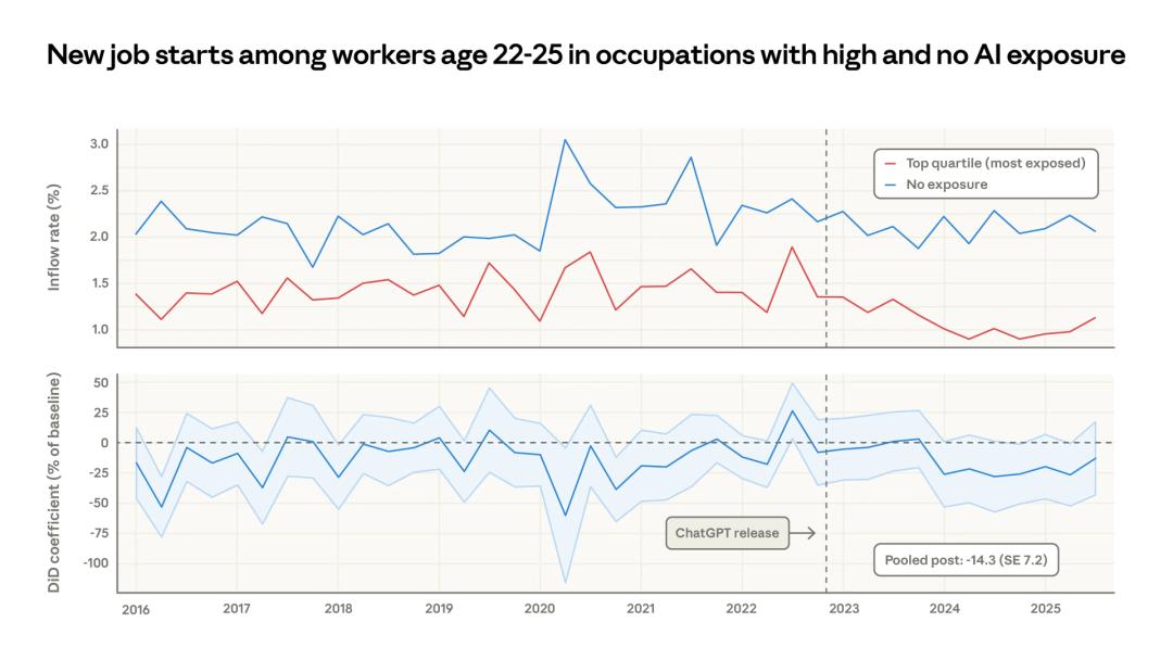 此外,Anthropic 的研究人员发现,剔除 2020 至 2021 年特殊波动周期后,2024 年两类岗位的青年招聘走势出现明显分化:企业面向青年群体的高 AI 暴露类岗位招聘意愿显著下降。其中,低暴露度职业月度新增入职率稳定维持在 2%,而高暴露度岗位新人入职比例下降约 0.5 个百分点。综合测算显示,自 ChatGPT 普及以来,高暴露职业的青年入职率较 2022 年下滑 14%,该结果处于边际统计显著水平;而 25 岁以上劳动者并未出现同类招聘萎缩现象。