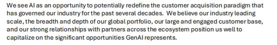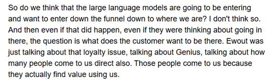 事实上,在2025年的Q4财报电话会议上,Booking的首席执行官Glenn Fogel也做出了类似回应,他认为大模型们不会直接进入转化漏斗的最底层。
