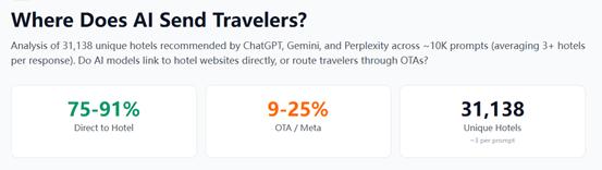 但另一方面,大模型给用户推荐的75%-91%的酒店链接,却直接指向酒店官网,而不是OTA。