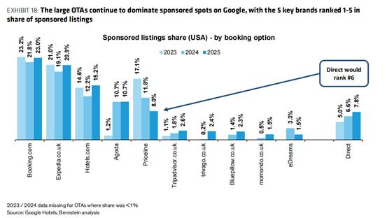 伯恩斯坦研报数据显示,谷歌的付费广告收入中,大型OTA占据绝对主导,美国市场前五名全部由头部OTA包揽。