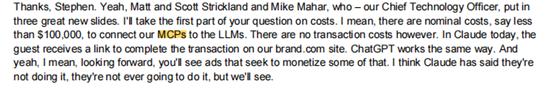 在温德姆的电话会议中是这样描述的:“将我们的 MCPs连接到大模型的成本极低,大约不到10万美元,而且目前没有交易手续费。”