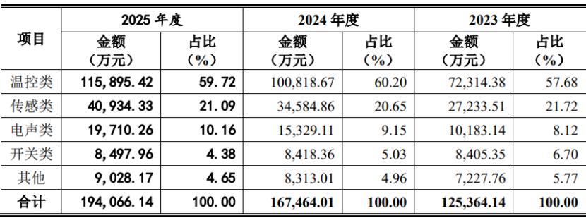 具体来看,2023年、2024年、2025年(简称“报告期”),温控类产品为公司贡献了60%左右的营收,传感类产品的营收占比在21%左右,电声类和开关等产品营收占比相对较低。