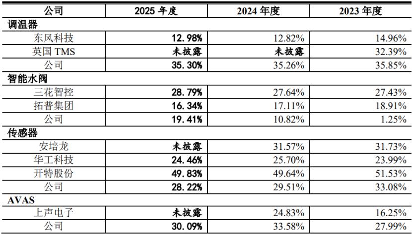 其中,公司的调温器产品毛利率高于东风科技,与英国TMS接近;智能水阀产品毛利率低于三花智控,2025年度高于拓普集团;传感器产品毛利率低于开特股份,高于华工科技,与安培龙较为接近;AVAS产品毛利率高于上声电子。