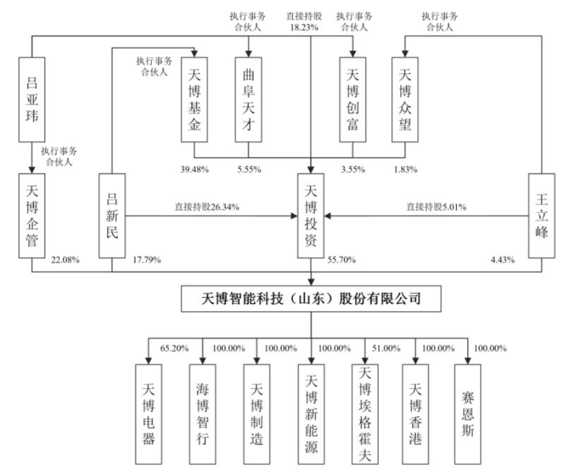 股权结构方面,吕新民、吕亚玮父子合计持有天博智能46.4%的股份,合计控制公司95.57%的表决权比例,处于绝对控股地位,为实际控制人。