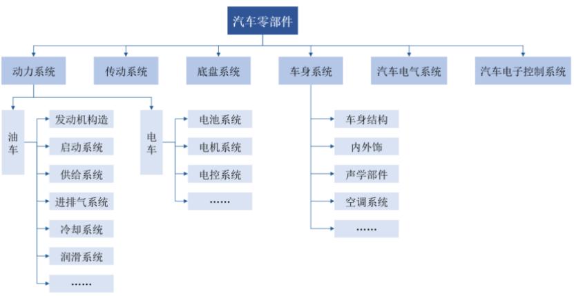 汽车零部件主要由动力系统、传动系统、底盘系统、车身系统、汽车电气系统和汽车电子控制系统这六大系统构成。