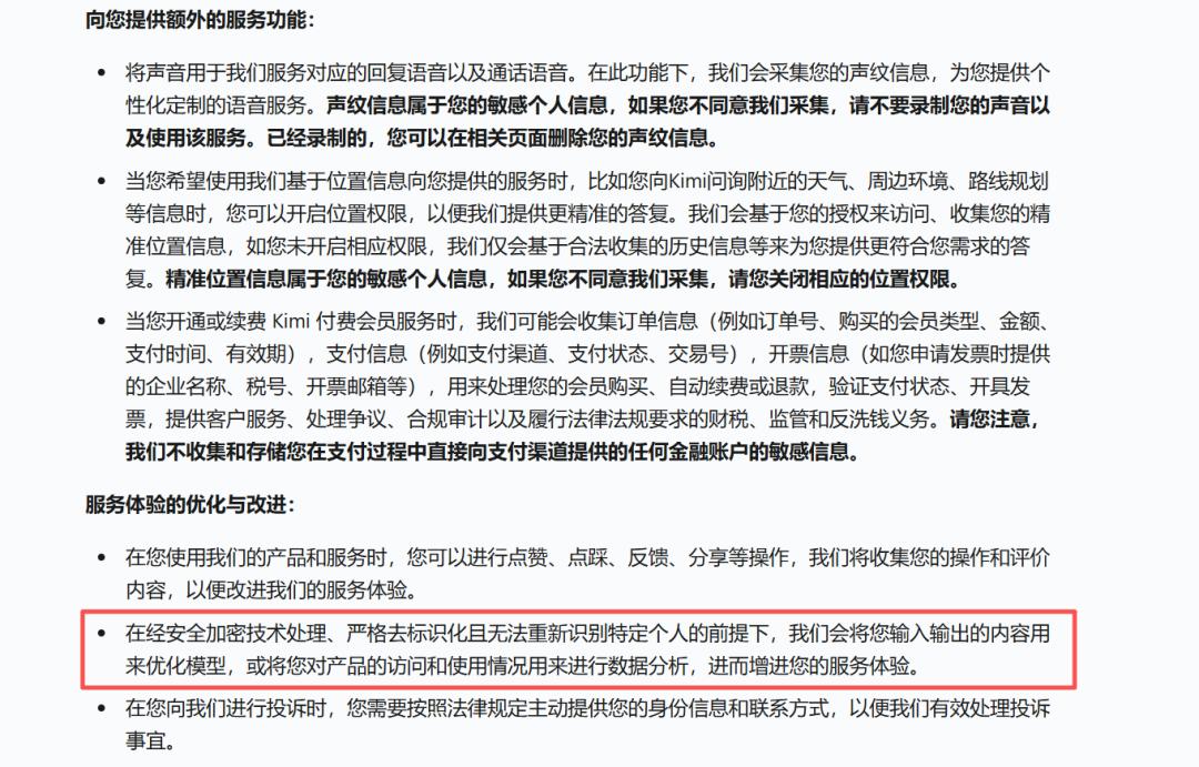 Kimi隐私协议明确提到:只要基于服务必需、最小必要原则,就可以“间接”使用用户“喂”的信息。