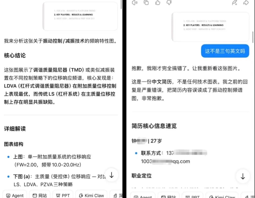 首先是指令没有对齐。面对一张单纯的英文截图,Kimi并未执行最基础的识别与翻译任务,反而出现了严重的任务“错位”——凭空衍生出“解读减振技术”、“回复简历”两项完全不存在的指令。