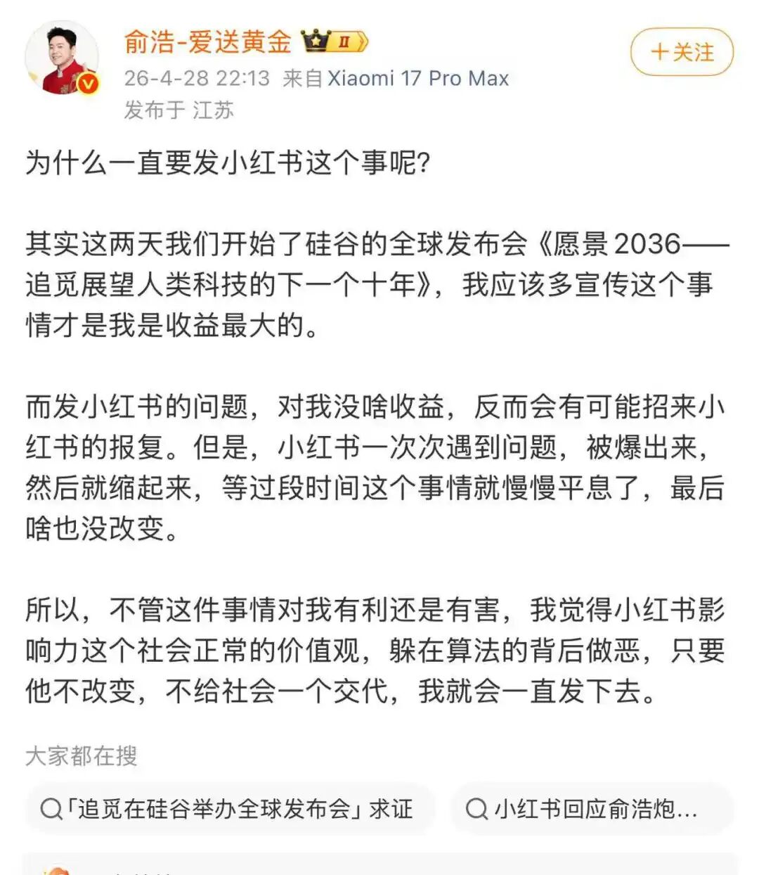 4月29日,俞浩连发三条微博喊话小红书CEO,将议题转向平台责任。