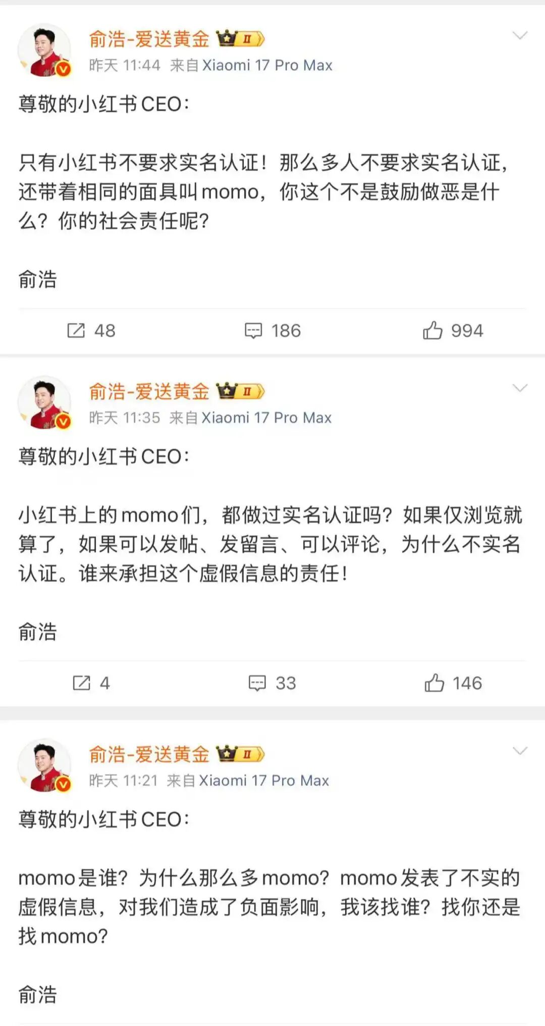 他问道:“momo是谁?为什么那么多momo?momo发表了不实的虚假信息,对我们造成了负面影响,我该找谁?”并在后续博文中提出,小红书上有大量使用“momo”名称的匿名账号,这种机制“不是鼓励作恶是什么?”
