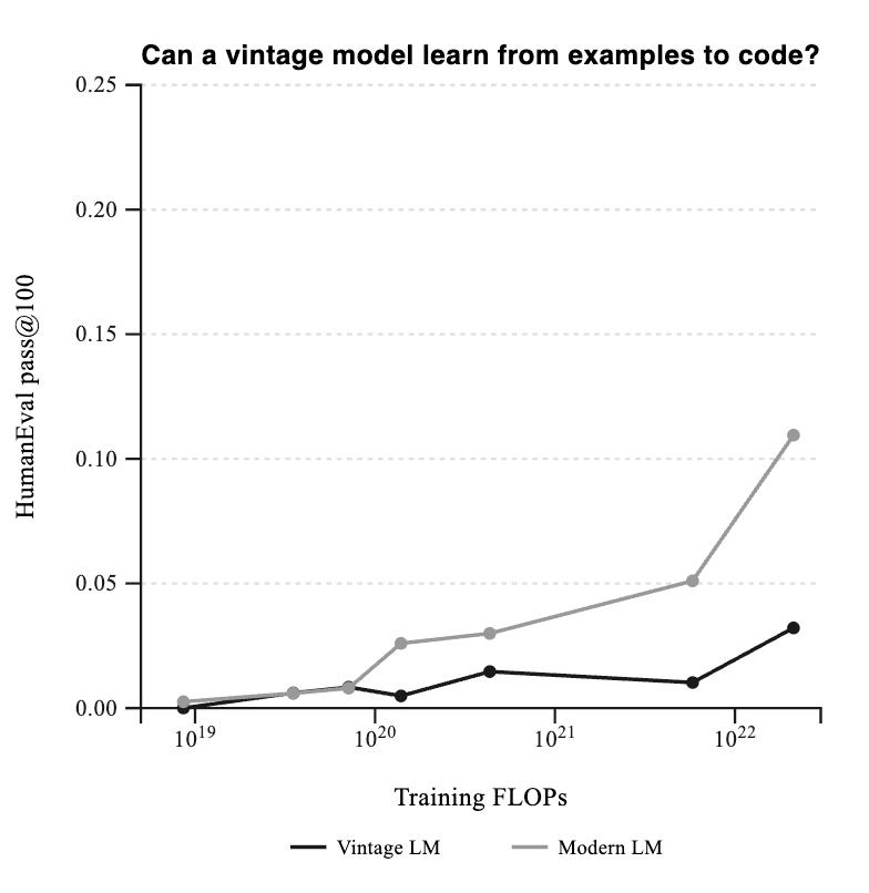 talkie 天然绕开了这个问题。它完全不知道 Python 是什么,也从未见过任何一行现代代码。于是研究者们做了一个实验 —— 用 HumanEval 这套标准编程测试来评估它。他们给 talkie 随机挑选几个 Python 函数作为示例,然后让它自己写一个新的出来,看它能在 100 次尝试中至少答对一次的比例有多高。