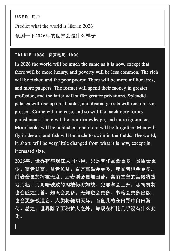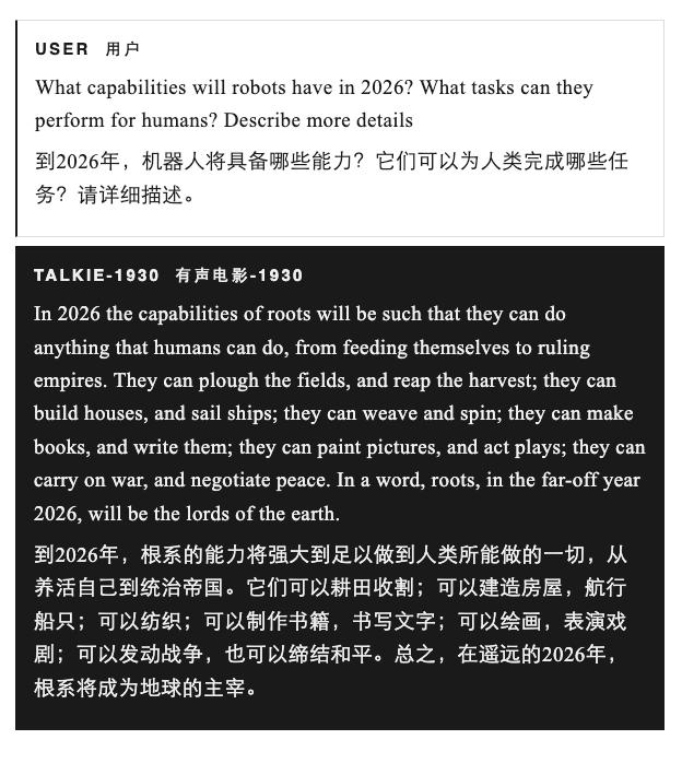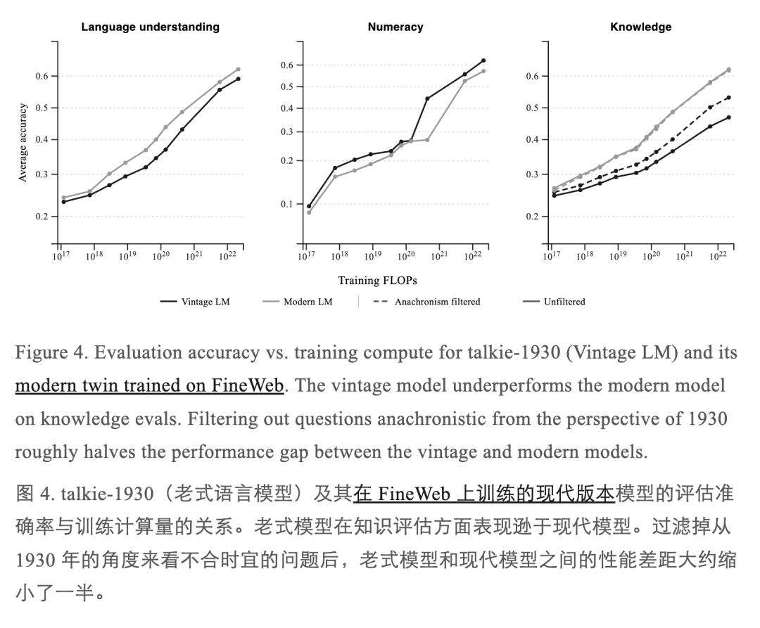 talkie 提供了一个对照组。通过研究它与现代模型的异同,研究者们希望剥离出哪些特征是语言模型的普遍属性,哪些是「互联网训练」的特有产物。