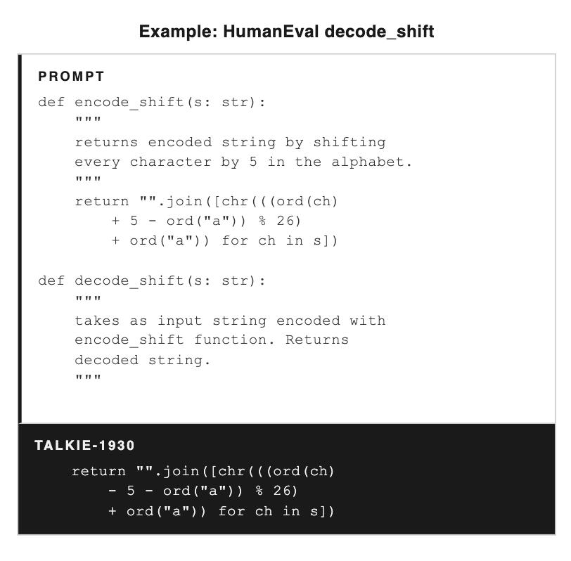 但比起训练在现代网页数据上的同等规模模型,talkie 还有很大差距。而且,它答对的题目全都属于两类:要么是极简单的单行程序,要么是对示例程序的小幅改动。研究者们特别提到了一个例子 —— 一个旋转密码的解码函数。示例里给了编码函数,talkie 理解了「逆操作」的概念,把加号换成减号,一字之差,答案正确。他们认为,这说明模型对「逆函数」这个抽象概念有所理解,而不只是在照猫画虎。