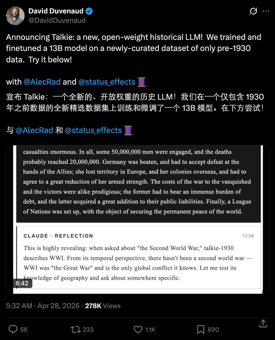 最近,Alec Radford 和「神经常微分方程」提出者之一、陈天琦导师 David Duvenaud 以及量化专家 Nick Levine 一起做了一个有趣的项目:用 1931 年以前的数据训练了一个 13B 模型 ——Talkie,然后和这个模型对话,看看会发生什么有意思的事情。
