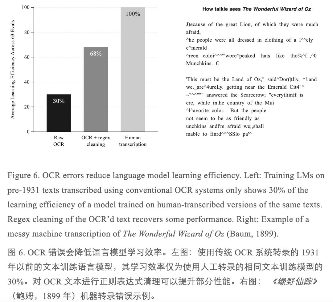 另一个麻烦是数据质量。1930 年没有数字出版,所有文本都要从纸质原件扫描、识别。传统的 OCR 系统对付干净的印刷品还行,碰上版式复杂或保存不善的旧书,识别出来的东西往往惨不忍睹 —— 字母错位、段落混乱、符号乱入。研究者们做过对照实验:同样的训练量,用传统 OCR 转录的文本训练出来的模型,性能只有人工转录版本的 30%。做一些正则清洗之后,能回升到 70%,但差距仍然很大。