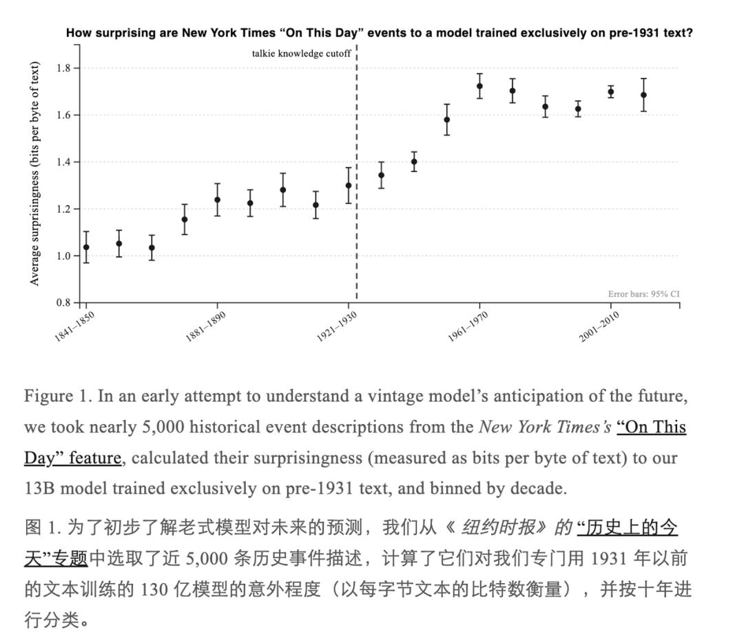 他们从《纽约时报》的「历史上的今天」栏目里抓了将近 5000 条历史事件的描述,然后测量这些描述对 talkie 来说有多「意外」。用信息论的语言说,就是每字节文本的惊讶度。结果正如预期的那样:1930 年之前的事,talkie 不觉得意外;1930 年之后,惊讶度明显爬升,在五六十年代达到顶峰,之后趋于平稳。