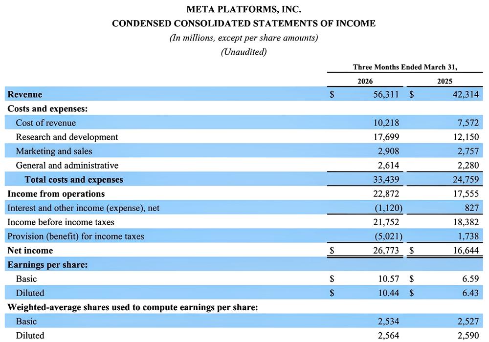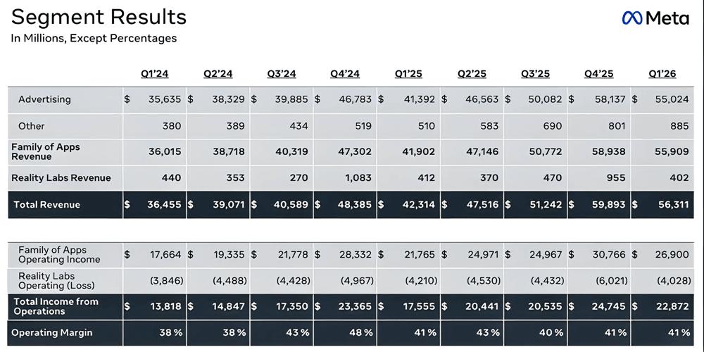 智东西4月30日报道,今天,Meta公布了2026年第一季度财报。季度营收为563.11亿美元(约合人民币3853亿元),同比增长33%,净利润为267.73亿美元(约合人民币1832亿元),同比增长61%,其中超过97.7%的收入来自Family of Apps的广告业务。